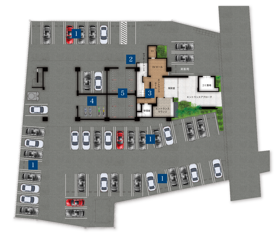 建物を囲むような敷地を贅沢にレイアウトした51台分の平置き駐車場を確保しています。