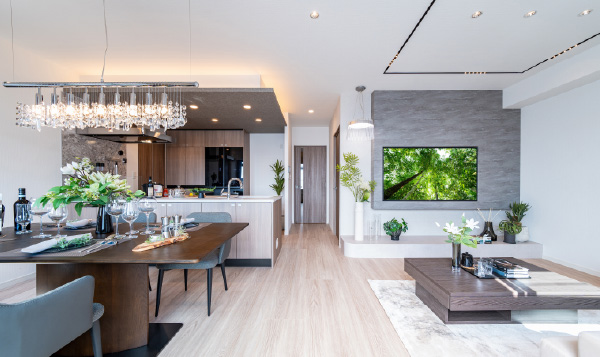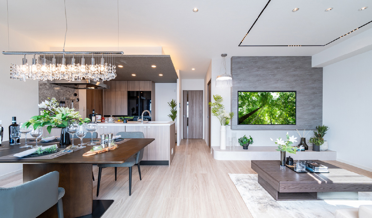 広がりのある空間に差し込む柔らかな光、開放感と快適性を兼ね備えたリビングダイニング。 自然と家族が集い、会話が弾む、暮らしの中心となる空間がここにあります。