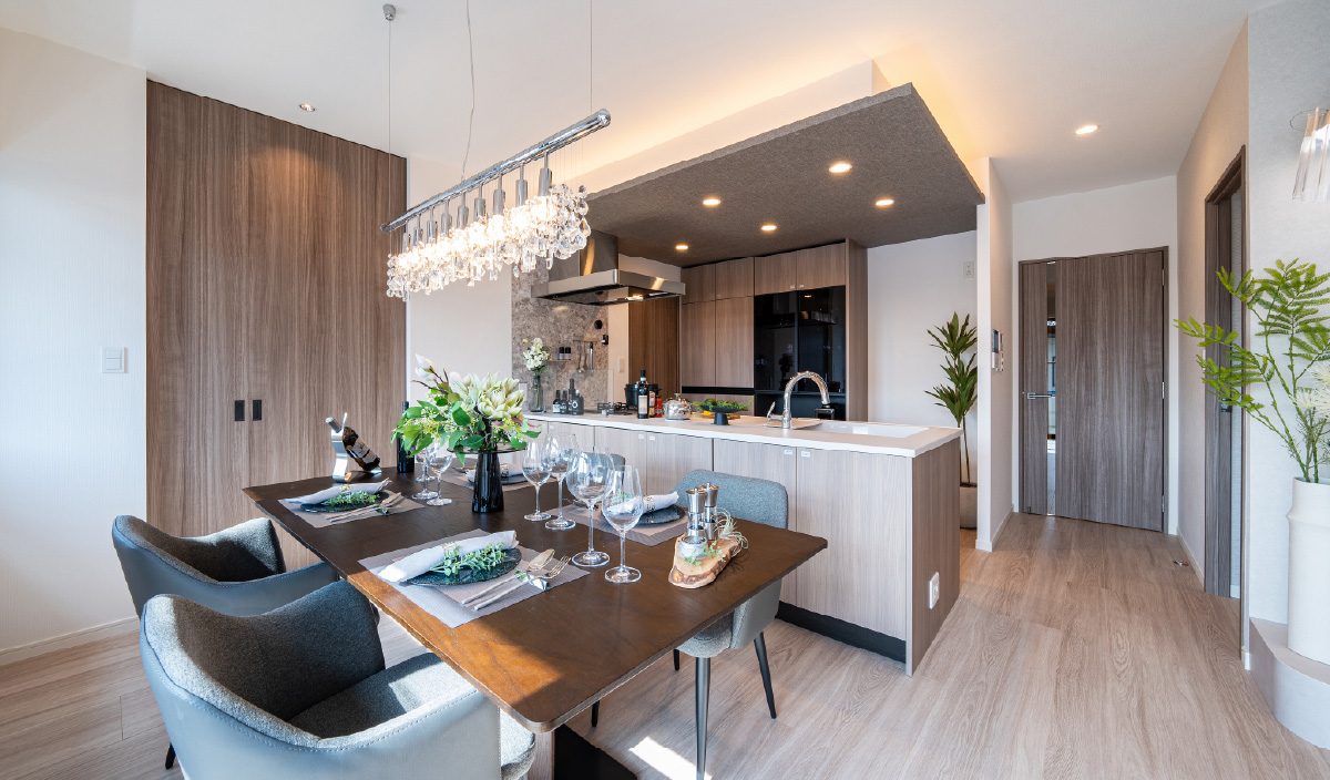 家族や友人と語らい、笑顔が集うダイニング。 光に包まれた空間は、食事の時間をより楽しく、特別なひとときへと変えてくれます。 ここで過ごす時間が、日々の暮らしをあたたかく紡ぎます。
