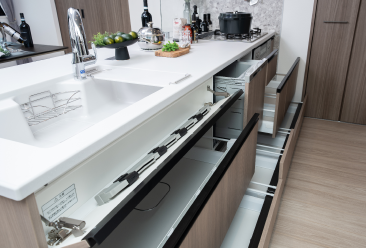 奥まで有効活用できるオールスライド式収納は、内部が見えやすく出し入れ簡単。スムーズに引き出せて優しく閉まるソフトクローズ仕様です。