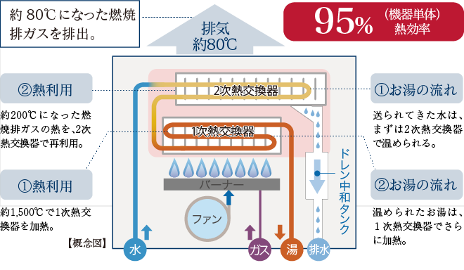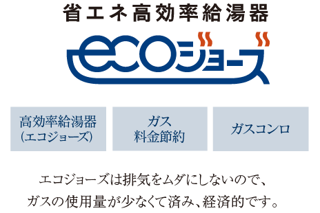 エコジョーズは従来の給湯器では外部に排出していた排気熱を回収して再利用することで給湯効率が向上した省エネ設計の給湯システムです。