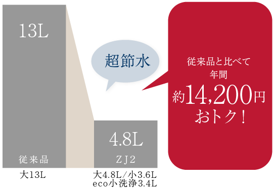 大洗浄4.8L、小洗浄3.6Lの「超節水トイレ」。使用頻度の高い小洗浄の水量を減らすことで従来品(大13L)と比べ約71%の節水を実現。水道料金なら、年間約14,200円もお得です。