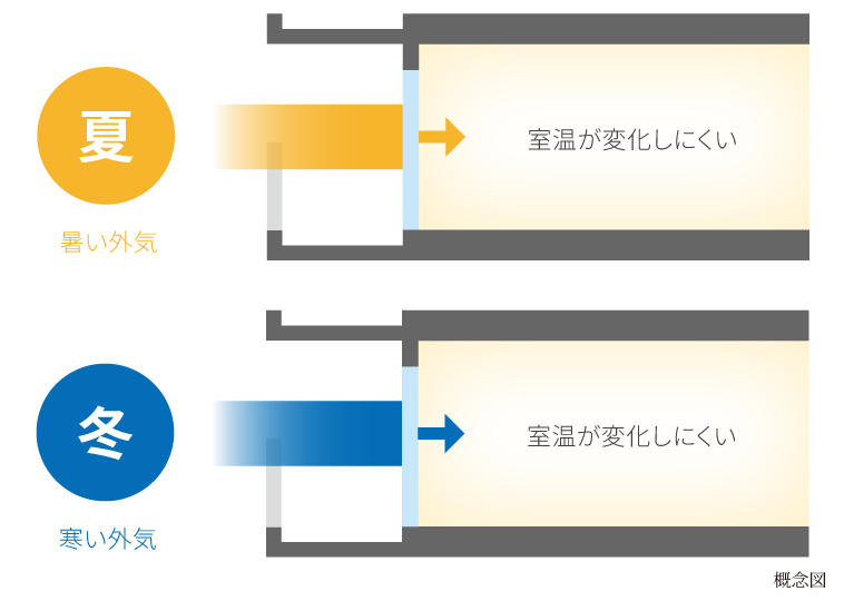 すべての窓のガラスには、2枚の板ガラスの間に乾燥空気(一部ガス)を封入したガラスを採用。優れた断熱効果で冬は暖かく、夏は冷房効率を高め、省エネに貢献します。結露しにくく、紫外線もカットするので、家具やカーペットなどの色褪せを抑えます。