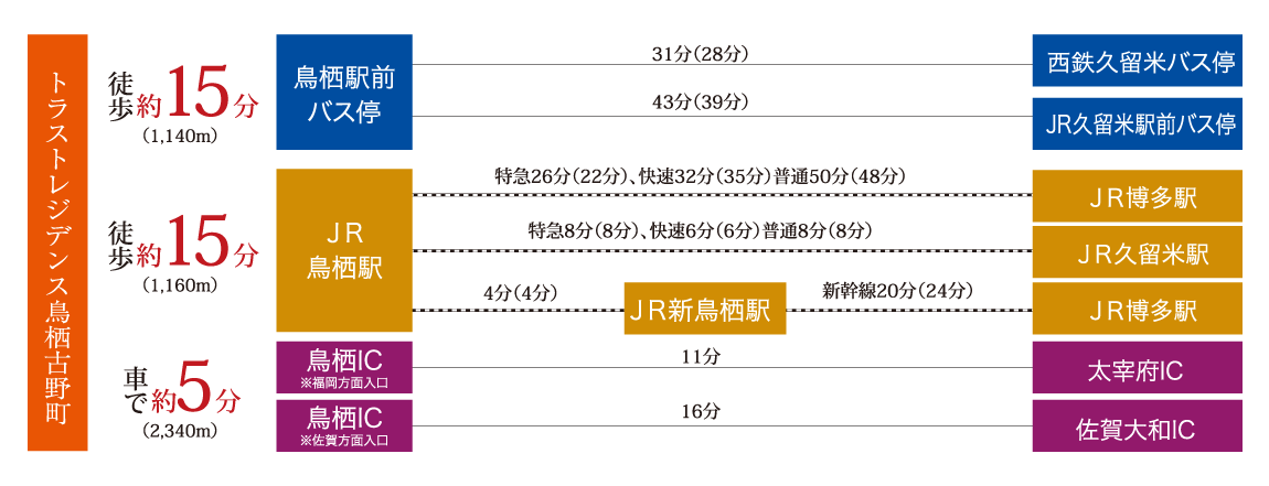 ※徒歩分数は80mを1分・車分数は一般道を時速40kmとして計算した概測時間で、信号待ち・渋滞等は考慮しておらず、端数は切り上げています。バス・JR所要時間は公式HPの検索機能を利用して、通勤時が平日の7時30分~8時59分出発のもので最多の便、日中平常時が平日の10時00分~15時59分出発のもので最多の便の分数を採用しています。乗り換え待ち時間を含めた所定の時間帯の最多所要時間を記載しています。所要時間は通勤時のものであり()内は日中平常時の所要時間です。所要時間は運行状況により異なります。掲載の情報は2025年6月時点のもので、ダイヤ改正等により変更となる場合があります。都市高速は公社HP、高速道路はネクスコ西日本サイトによる標準所要時間を表示しています。